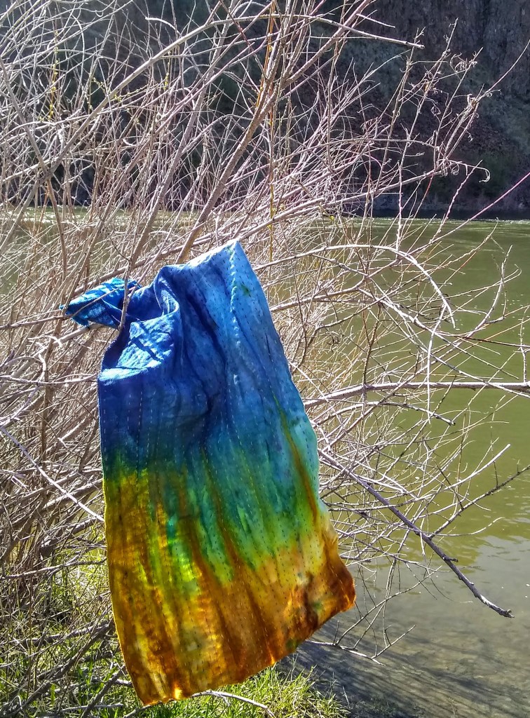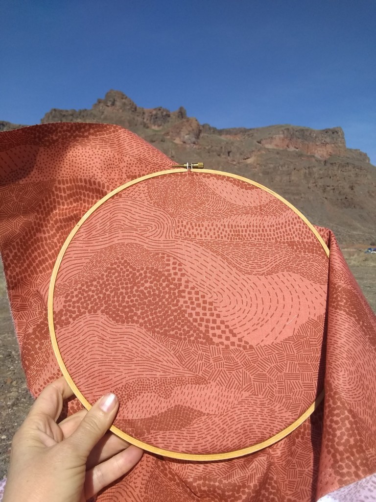 The time that I am getting to spend stitching is often while my husband is fishing. Instead of burying my head in a book or looking at rocks (I am trying to minimize the rock collection in my already cluttered space), I stitch. I have sewn in the Owyhee canyon, on the Wallowa, Columbia and John Day rivers, various ponds in the Umatilla Wildlife Refuge and in 4 different RV parks. I have also stitched by a couple of campfires and several grilled meals. I love that these projects are so portable and wonder why I haven’t always had a hand sewing project tucked away in my purse, just like an emergency granola bar. I really do not have a clear plan of what these projects will become; I’m simply enjoying the process of sewing. Not to mention sewing outside in the beautiful western U.S.