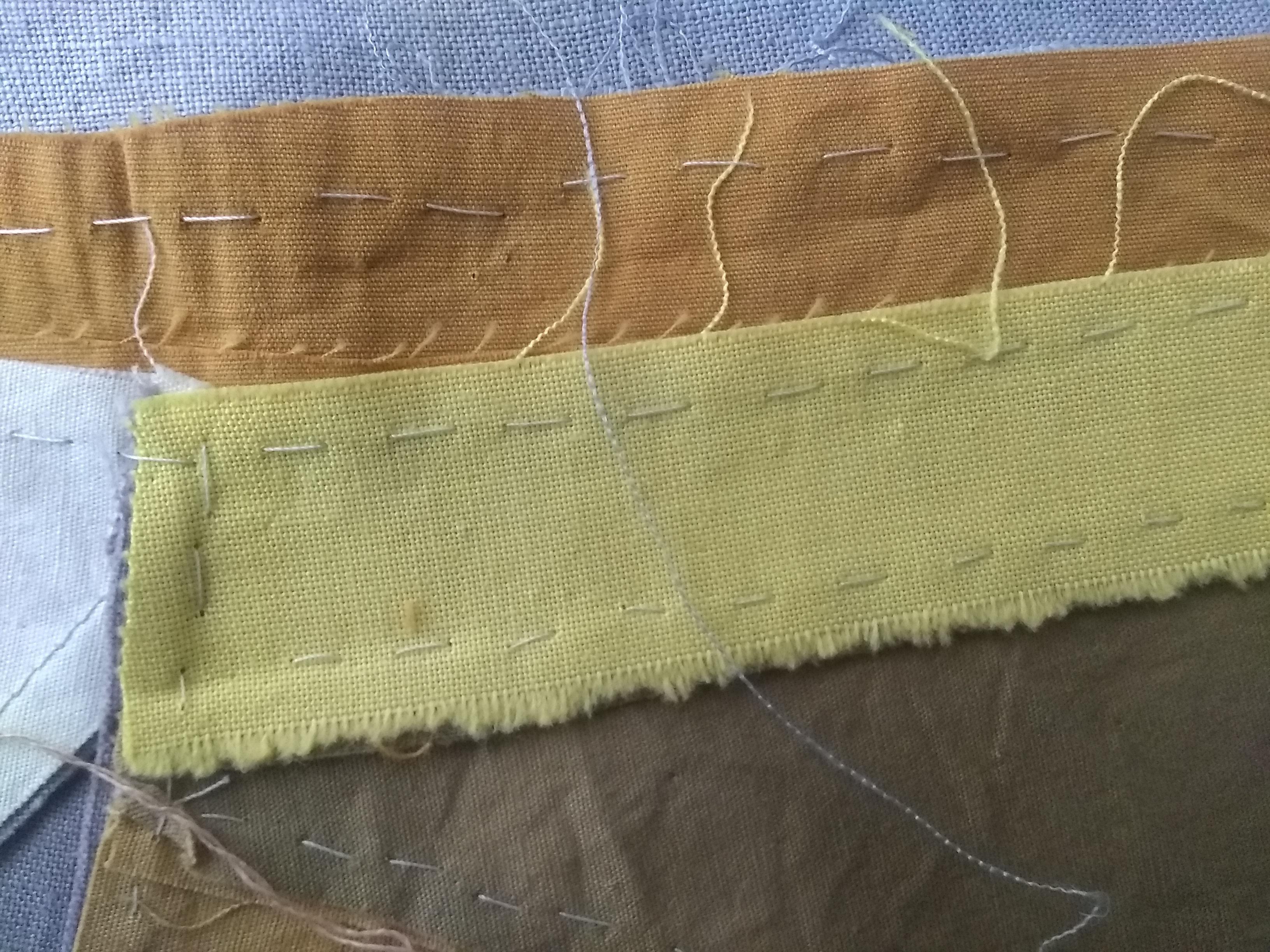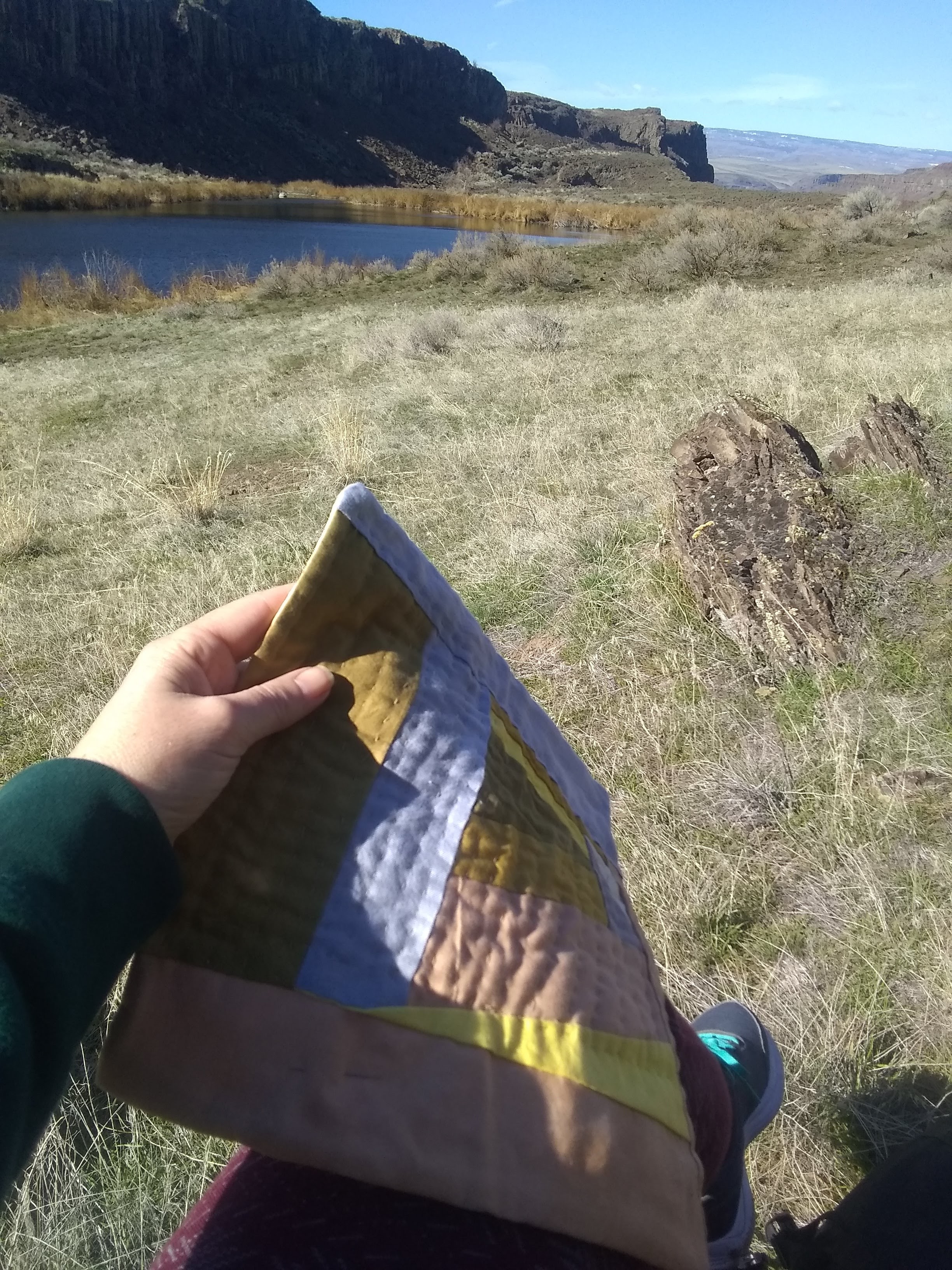 This mini quilt was made for my surgeon whose expertise and care cannot be quantified. After a very long search, I knew at my first appointment that I was in the right hands with her. Therefore this quilt was made entirely by my hands — hand dyed, hand pieced, hand cut (no scissors, no measurements) and hand quilted. No subtlety here folks! This is my first hand pieced quilt and it is very different from hand quilting. My initial block did not stay together as my stitches were too loose and I did not have a good anchor for my thread. Once I discovered that a couple of initial back stitches at the beginning and end secured the thread, my piecing became more stable. I made the majority of this quilt while propped up in either bed or on the couch, a heating pad on my back and one on my abdomen, a large quilt on my body, a bag of scraps by my side. I finished the last of the quilted rows outside on my first (short, slow) hike while my husband fished — exactly one month minus a day after my surgery. After I finished the quilt and saw the photographs in the great outdoors, the word HEAL immediately jumped out in the design. Whoa, that was completely unexpected!