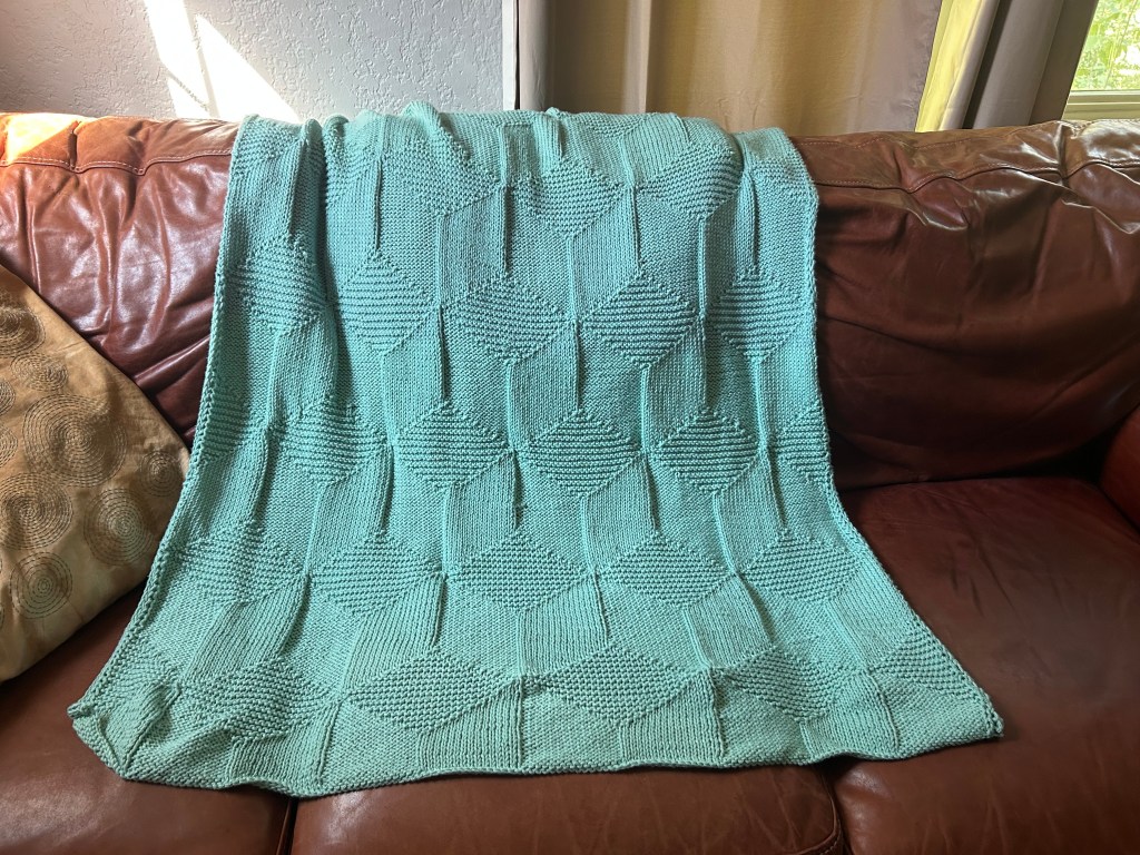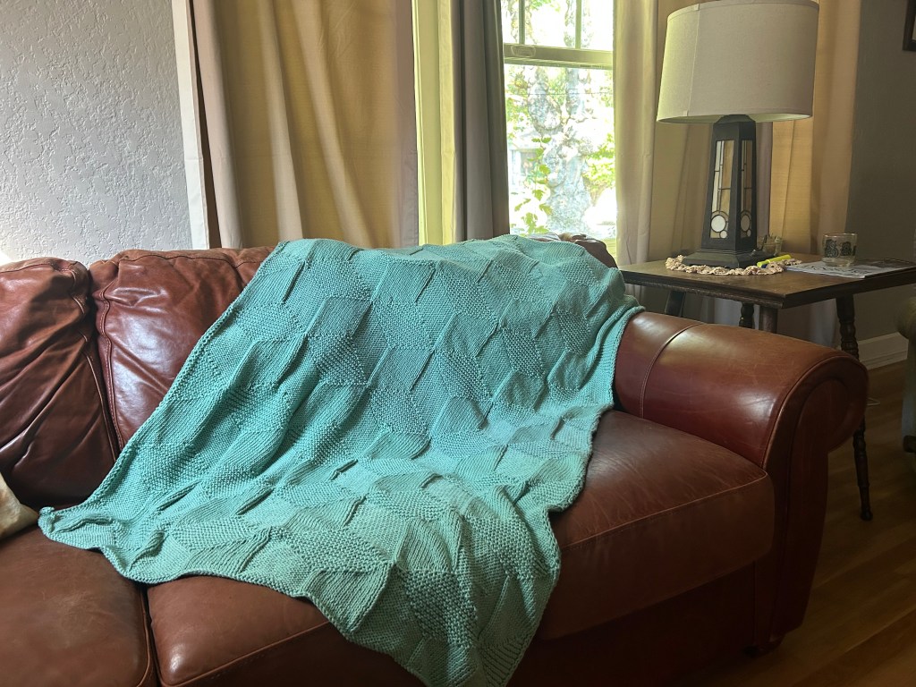Last but not least, the blanket. This is a gift for my beloved sister out of my final Joann’s purchase, for the unreal cost of about $5. (8 skeins at around 60 cents apiece.) I will openly brag here that I have the greatest sibling in the known — and unknown — universes. I love being her sister and that I got to spend time making this blanket for her. The pattern is “Tumbling Blocks” by Purl Soho (one of the greatest online resources for patterns, IMO) which provided the perfect balance of challenge and zone out stitching. Quilters will recognize the tumbling blocks pattern as a very popular quilt design, too. I enjoyed the pattern so much, that I am now stitching one for up myself in a golden yellow, also out of Joann closeout yarn. Please take a moment to admire my new yarn bowl custom-made by local Yakima, WA potter Lowell Keech. I am smitten with the design and am grateful to have such a beautiful vessel cradle my yarn. Because art begets art.